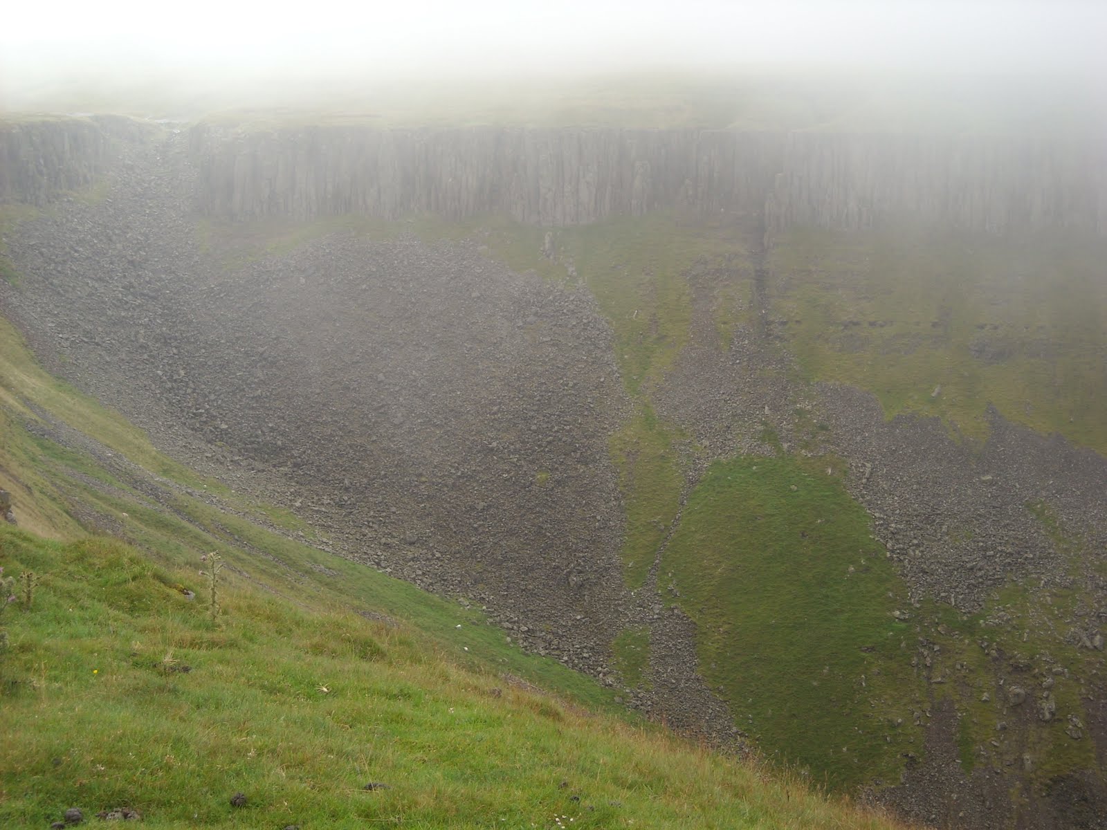 More rain on and off during the night. The temperature dropped quite low too. By this morning it was a thin drizzle driven by a blustery wind. Wispy clouds like torn remnants of lace where moving swiftly across the sky. Was in no big rush to get underway. Having a strip bath in the tent on a chilly morning is a tad masochistic but I prefer to be heading out with some semblance of cleanliness. An easy walk up to High Cup Nick. There are some lovely spots up there for a wild camp. The Nick is an impressive piece of geology; a mighty cleft cutting deep in to the surrounding high ground. Got a few odd looks from a couple passing by as I sat down in the drizzle, just happy to be drinking in the magnificent scenery. Thin misty clouds drifting through added to the atmosphere.